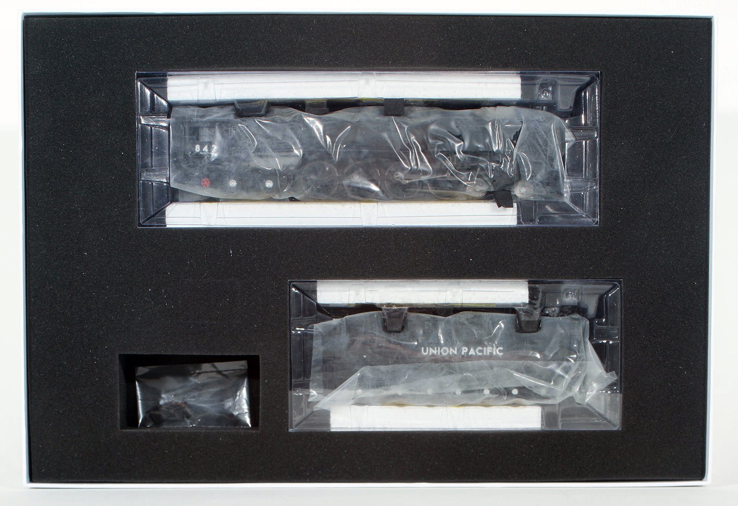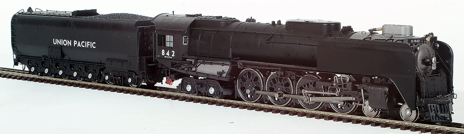 Athearn #G97273 FEF-3 4-8-4 w/DCC & Sound, UP #842 Key Features Lighted number boards Individually-applied detail parts, including brass- painted bell and whistle, piping, valves, generator, steps, air pump, air tanks, reverser and coupler lift bar Metal handrails Builder’s plates Front coupler pocket can be inserted to mount operating coupler Non-operating classification lights Firebox with rivet detail Adjustable cab windows Boiler backhead with full details and printed gauges