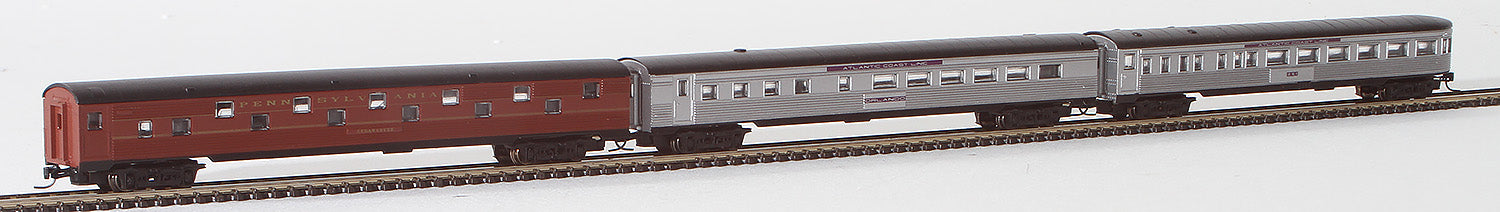 6 different streamliner cars painted and lettered for different American railroads. 1 Atlantic Coast Line baggage car. 1 Richmond, Fredericksburg & Potomac passenger coach. 1 Atlantic Coast Line dining car. 1 Atlantic Coast Line sleeping car. 1 Pennsylvania duplex roomette car. 1 Atlantic Coast Line chair observation car. Item is equipped with Kadee couplers. Pre-Owned but in mint condition with original box.